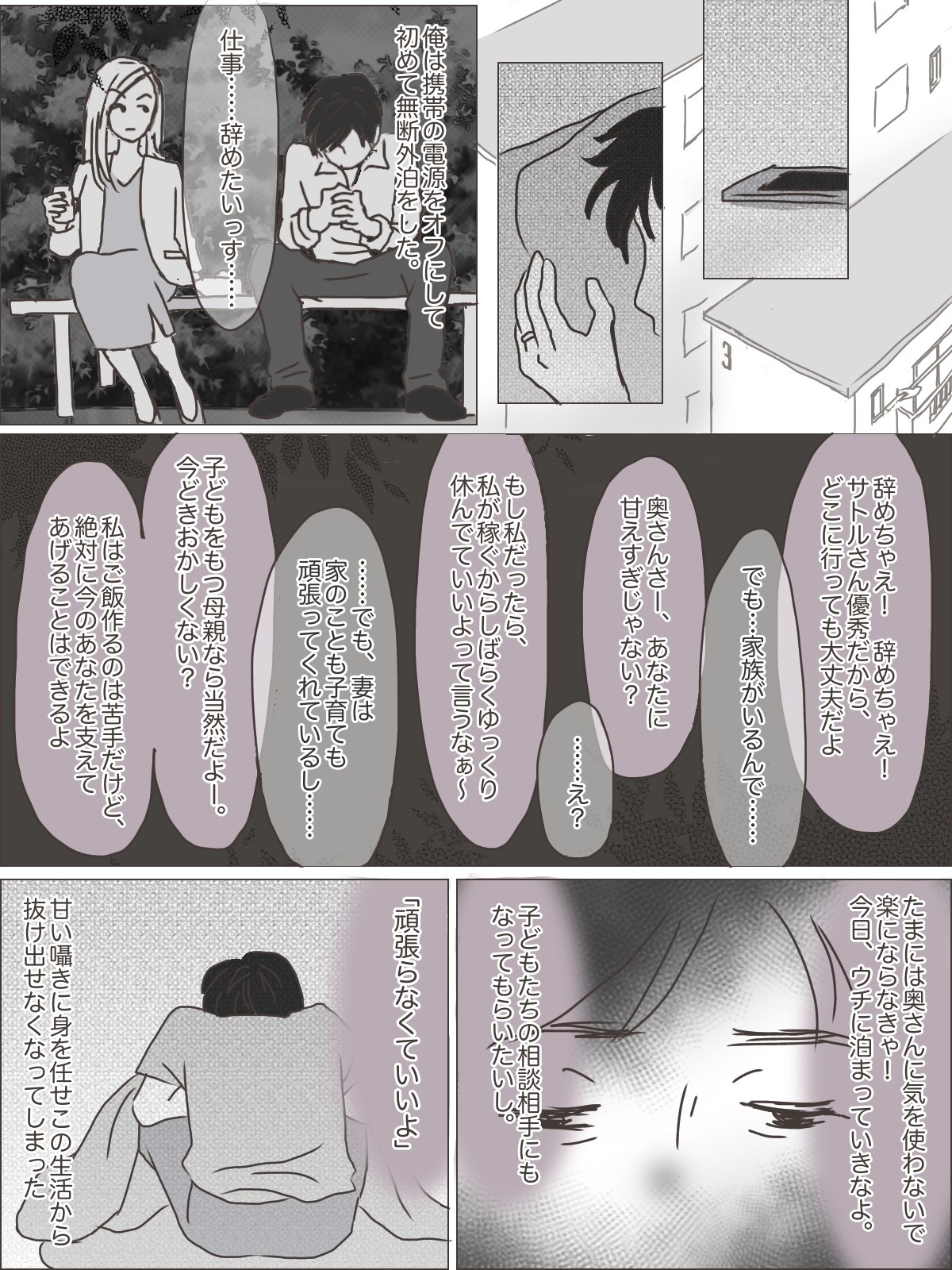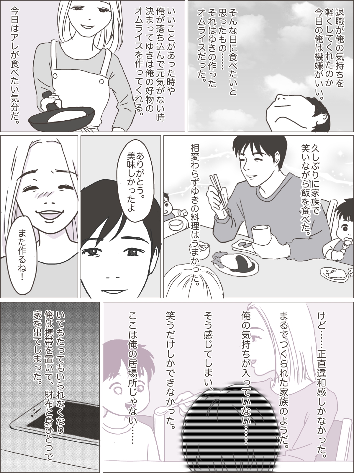 自宅に帰る日は気が重く、妻のゆきに「どこにいたの?」と質問責めにされる。俺はひたすら「公園……」と言い続けた。