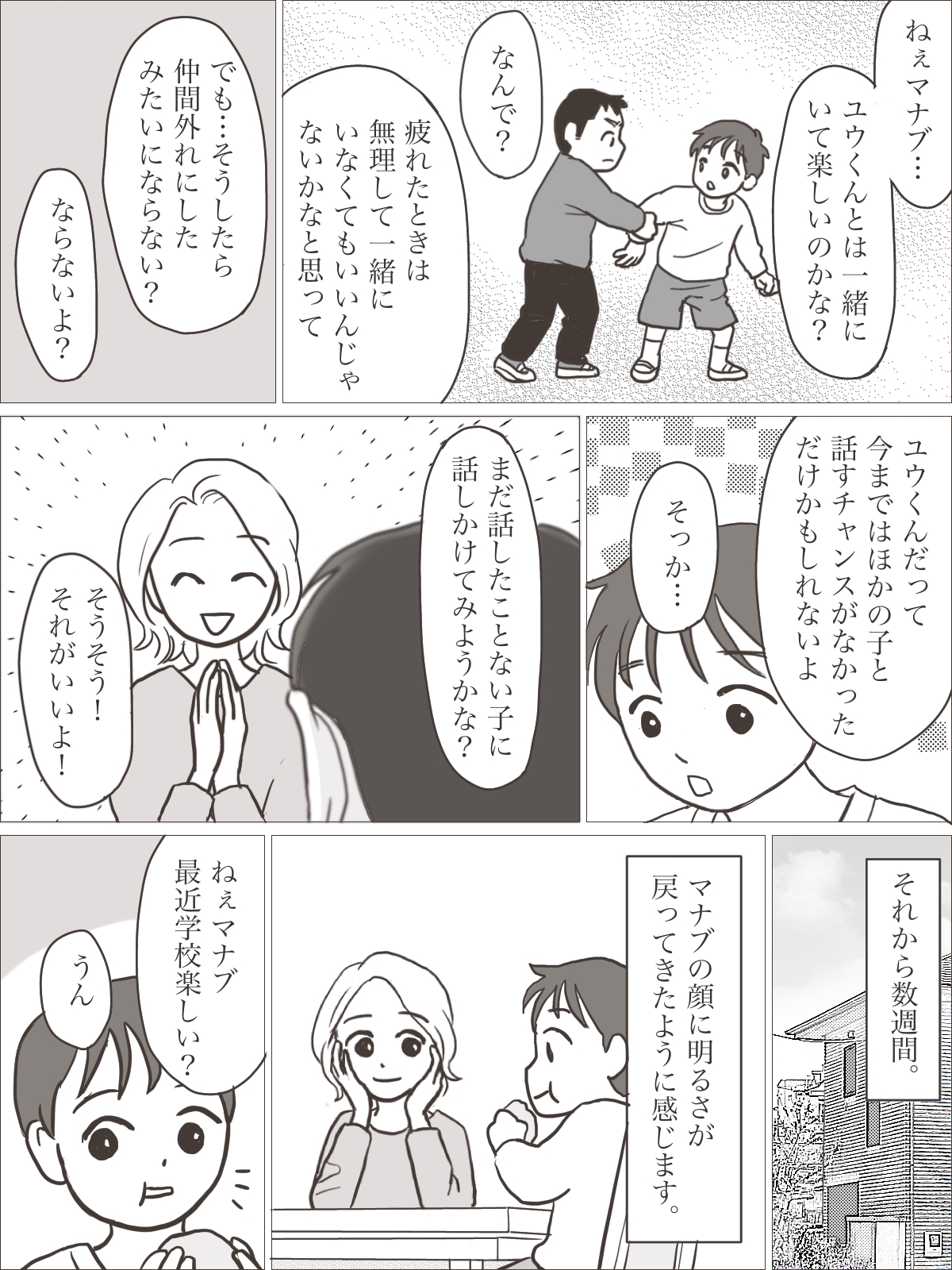 親としてはマナブが嫌なことをされて悲しい思いもしましたが、自分の考えと行動で乗り切れたマナブの姿に頼もしさを感じた出来事でした。