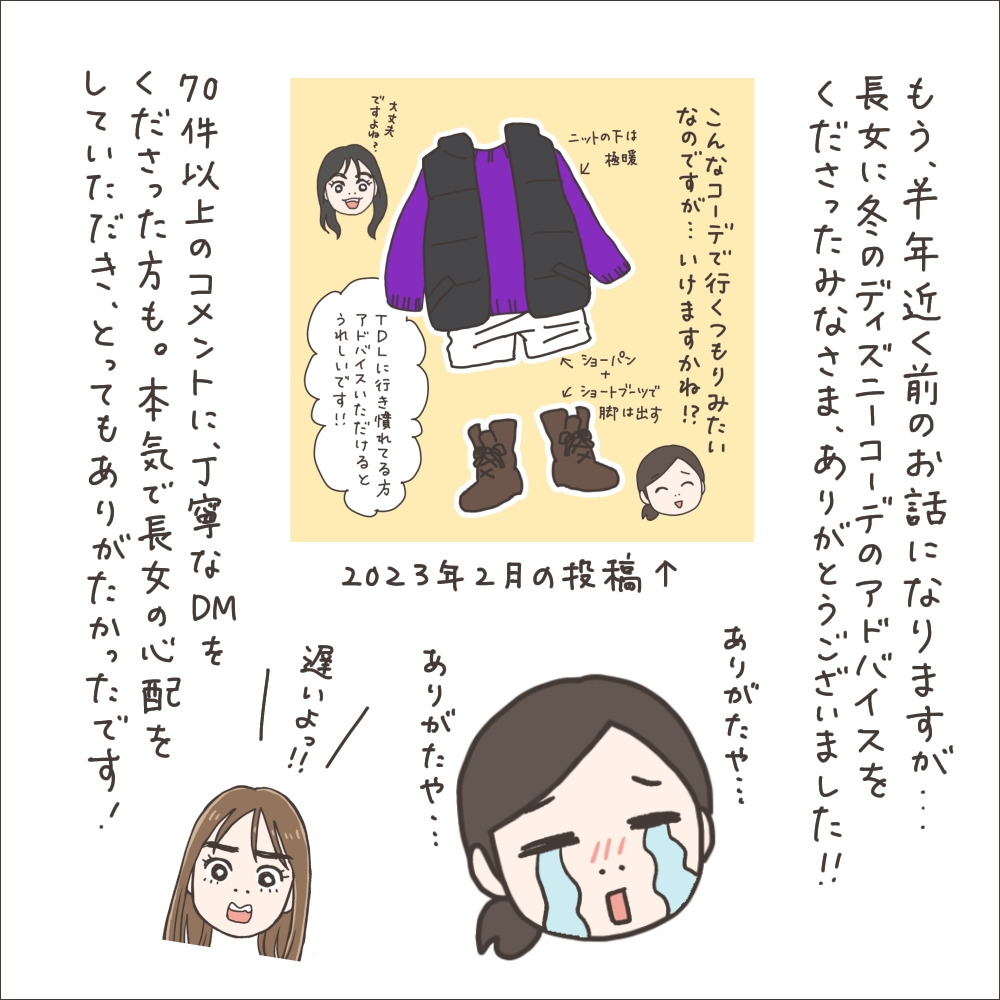 今回は大変大変遅くなってしまいましたが、以前投稿の中でご相談した、長女の冬の夢の国コーデに関するご報告です。