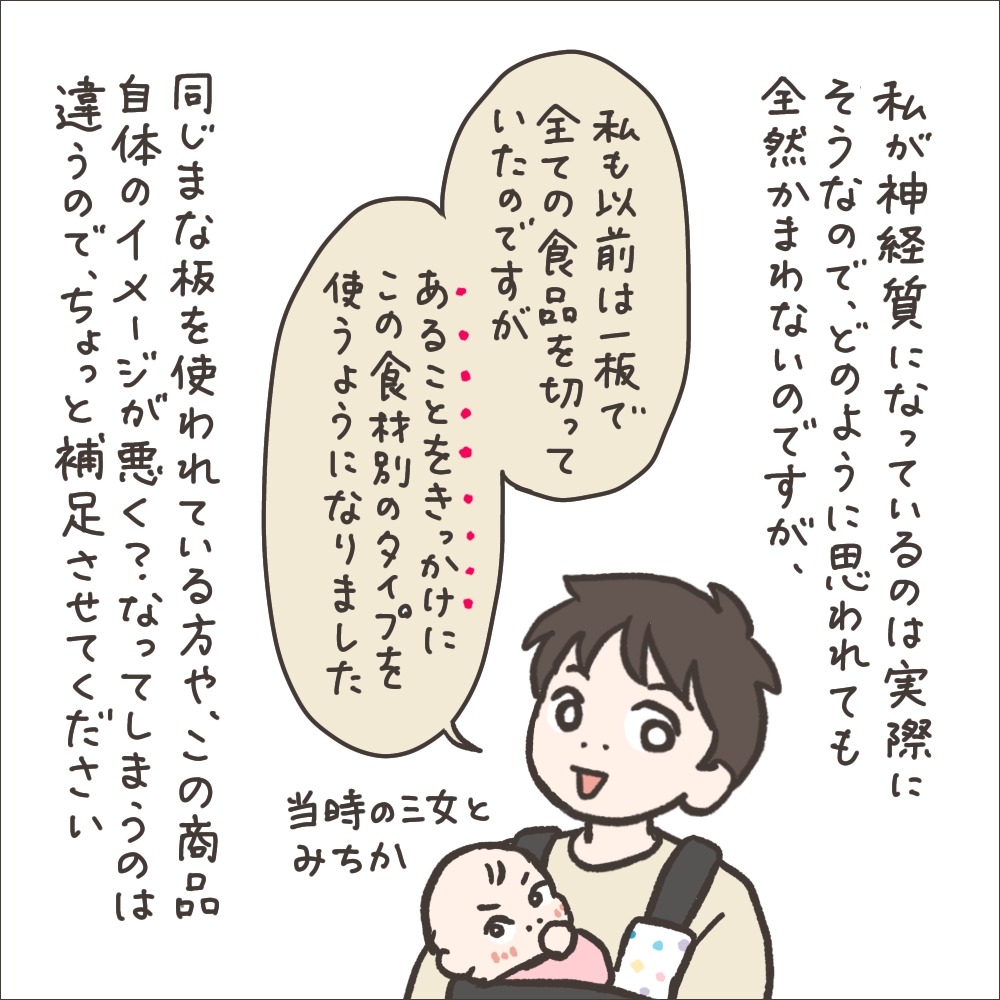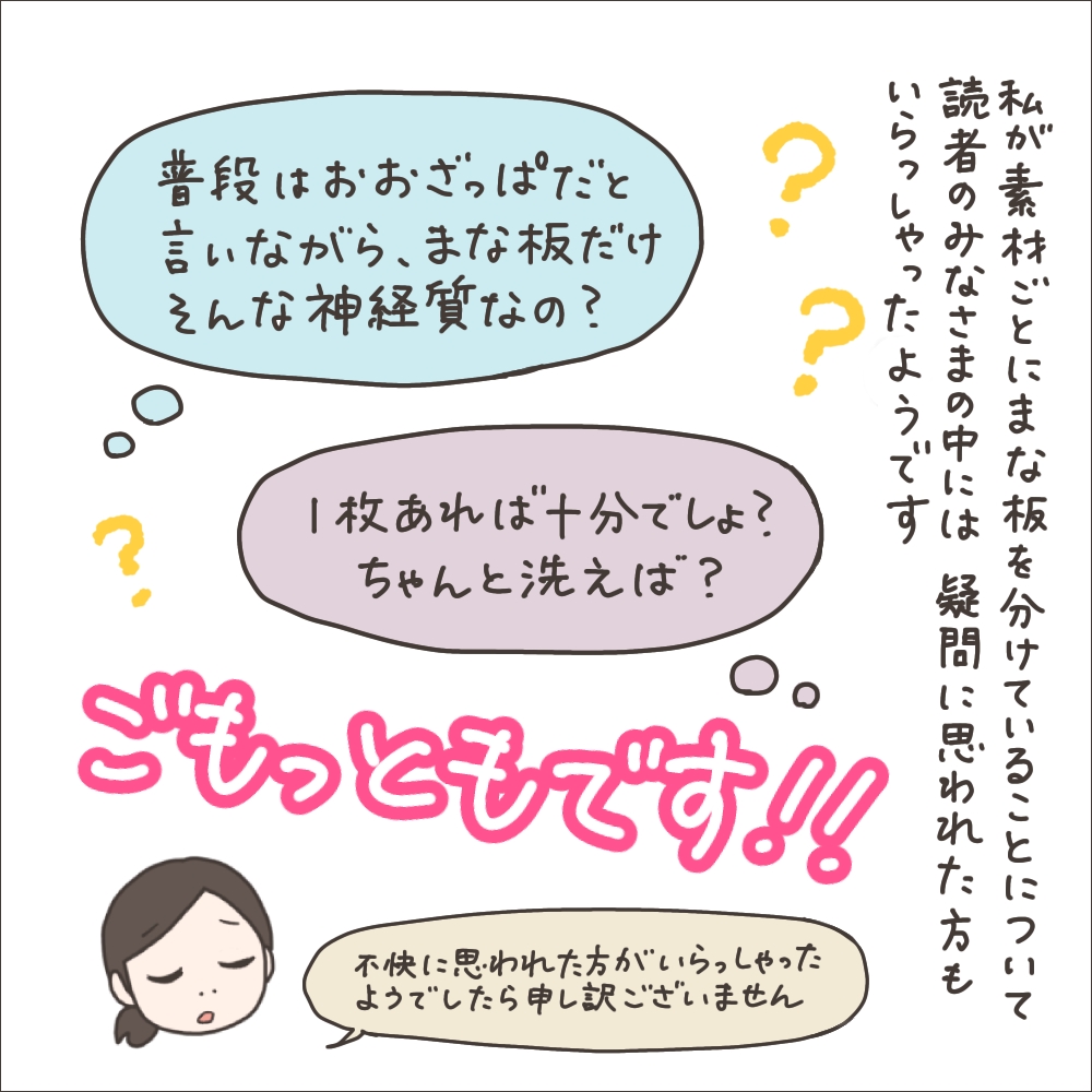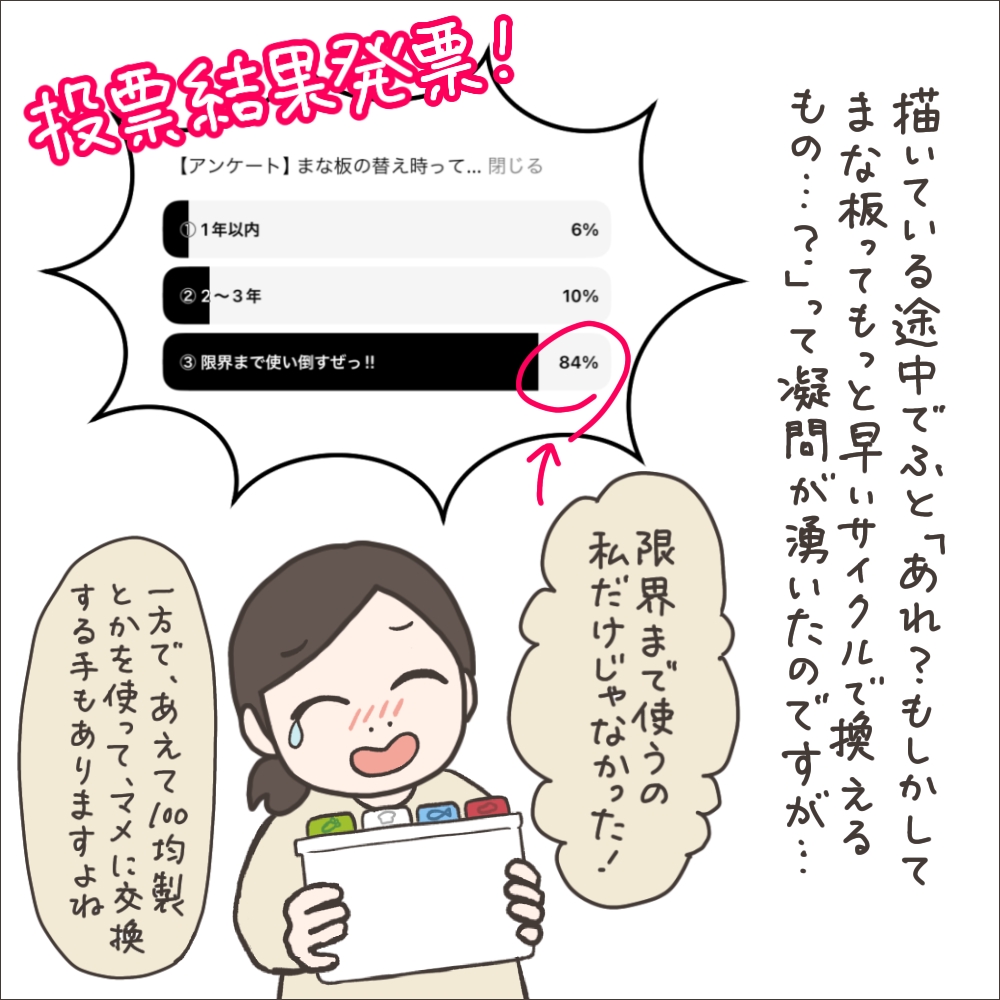 漫画を描きながら「もしかして『まな板はもっと早く交換すべき!』とか言われちゃうかな…?」と思って取ってみたアンケートだったのですが、結果が正反対過ぎて笑いました。