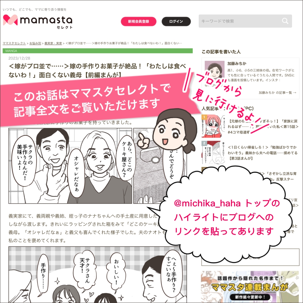 <嫁がプロ並で…… /後編>嫁の手作りお菓子が絶品!「わたしは食べないわ!」面白くない義母 2023.12.30