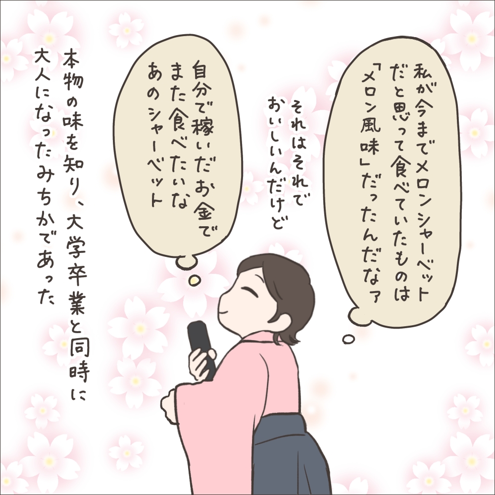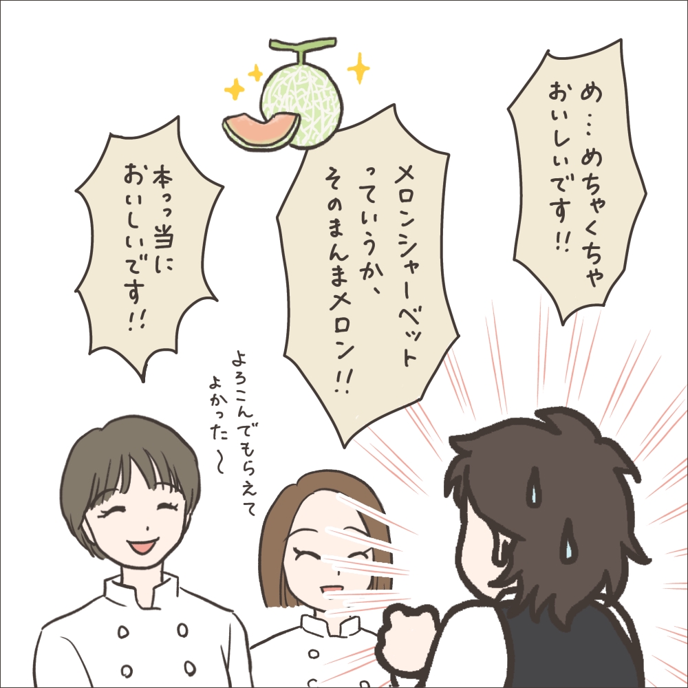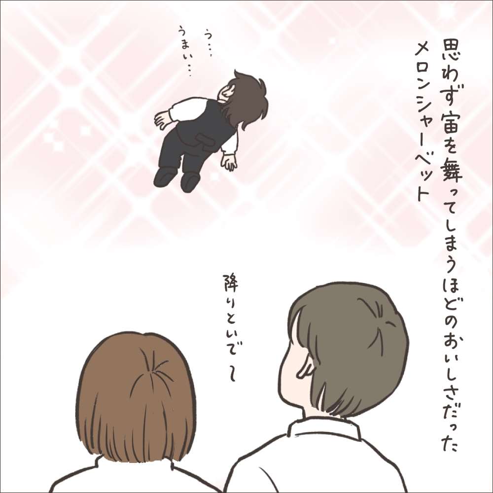退職記念に特別に食べさせていただいたメロンシャーベット、あまりのおいしさに思わず浮いてしまいました!笑