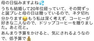 前回の投稿(インスタ含め)で母の日プレゼントについてアドバイスいただけないかとお尋ねしたところ、コメントやDMでたくさんのオススメアイテムを教えていただきました!